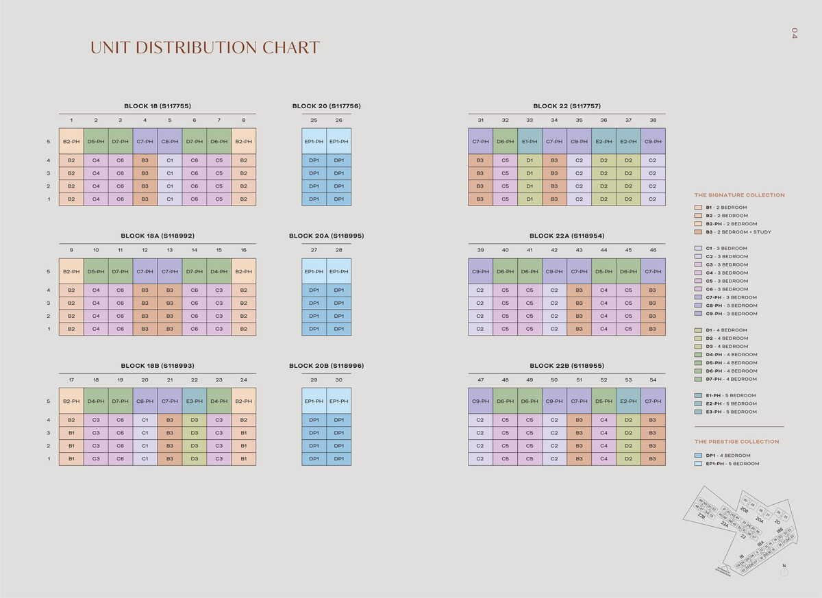 The development is made up of 9 five-storey blocks which will house 270 residential units. The unit mix includes 2 to 5-bedroom units, with the Signature and Prestige Series. The Signature Series includes 2-bedroom and 2+study units, 3-bedroom units, 3-bedroom penthouses, 4-bedroom units, and 4-bedroom penthouses. The Prestige Series includes 4-bedroom units and 5-bedroom penthouses, which come with private lifts, luxurious appliances, and fittings from high-end brands. The project's location is on a rare hillside plot overlooking Kent Ridge Park, with some units potentially having sea views.